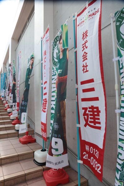 体育館入口の前の階段にものぼりが! すごくいい感じになっていました