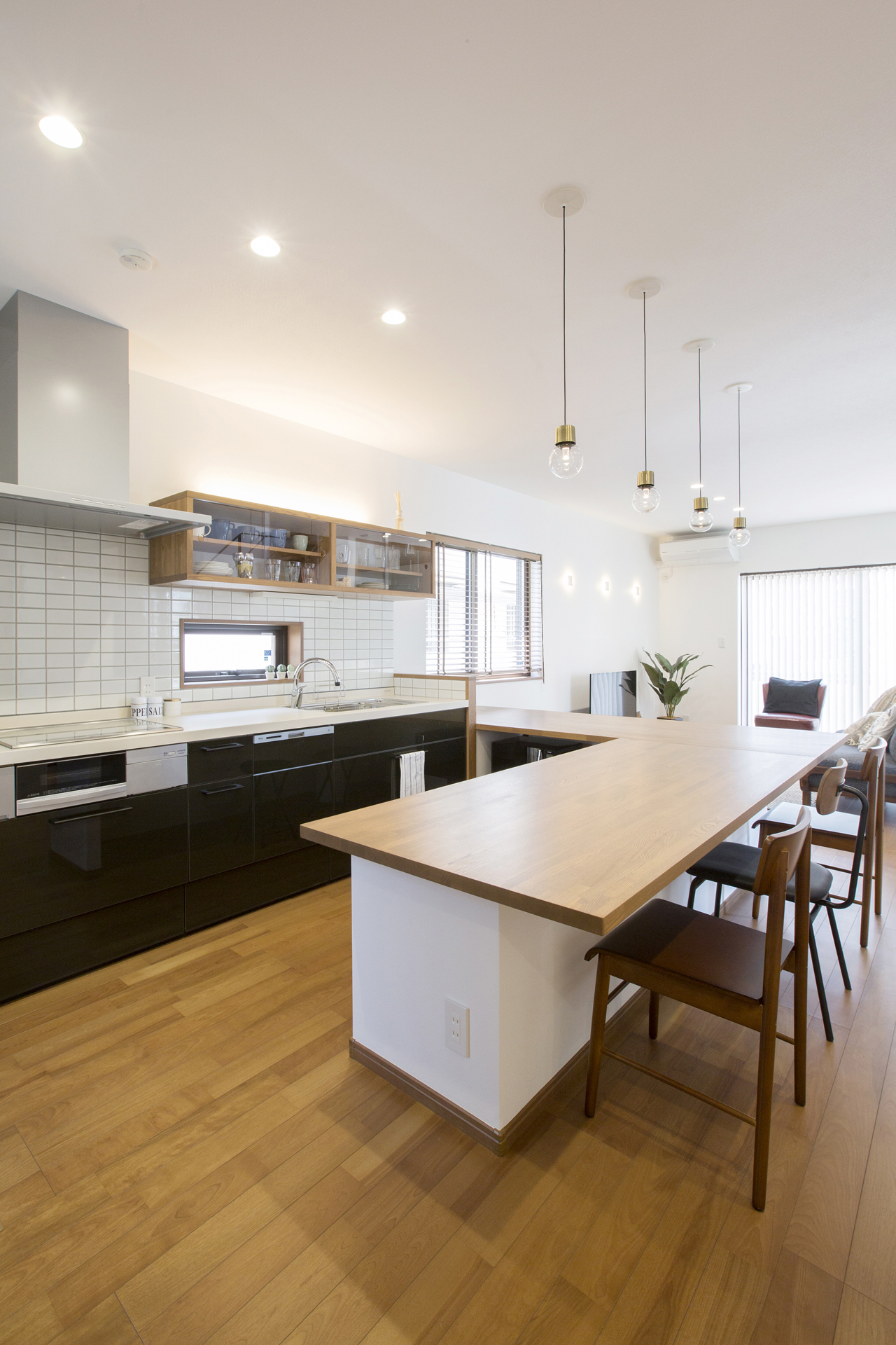 キッチンとカウンターを一続きにしてコの字型にレイアウトしました。