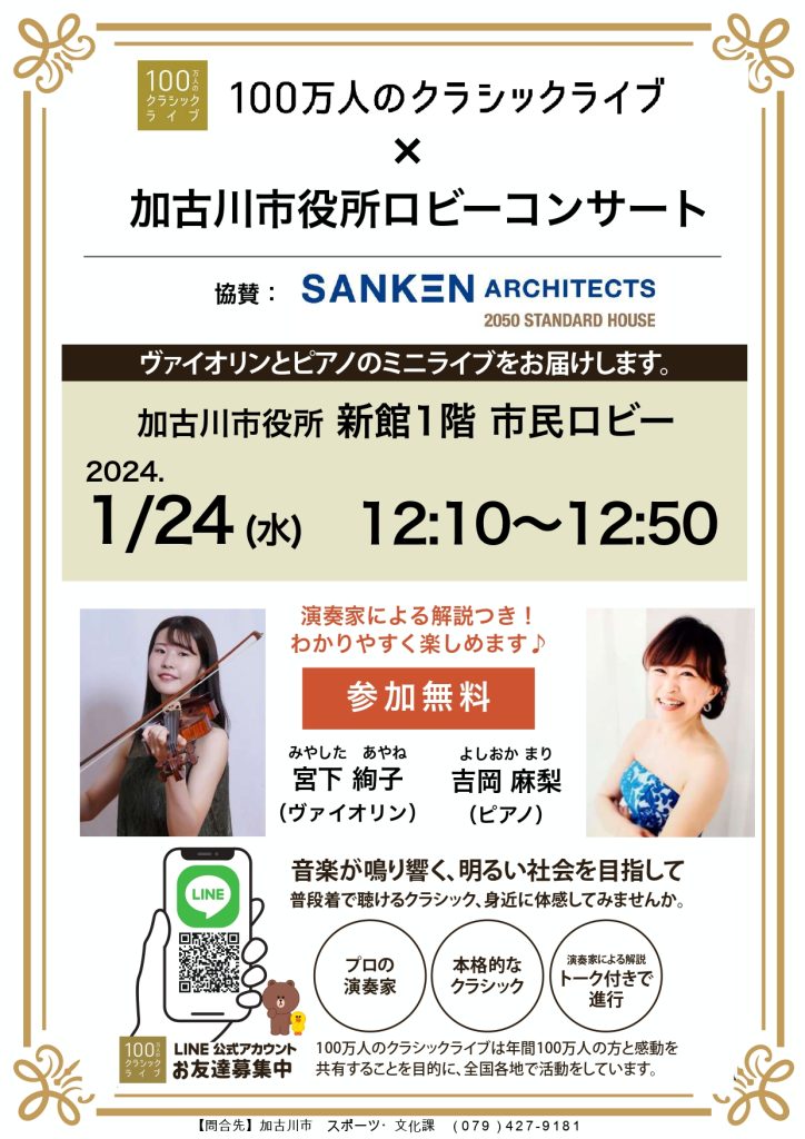 1月24日(水)に加古川市役所新館1階市民ロビーで弊社協賛にて100万人クラシックコンサートが開催致しました。