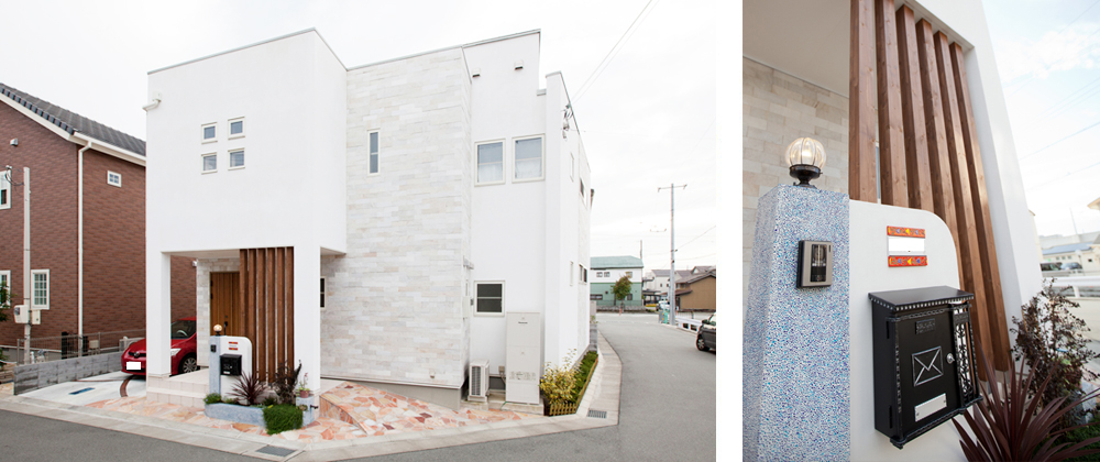 真っ白な漆喰壁とアジアンテイストなエントランス