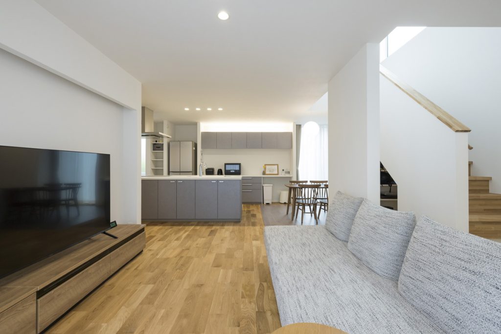 LDKがひとつづきとなった大空間。落ち着いた色の床は、ナラ材オイル仕上げ。
