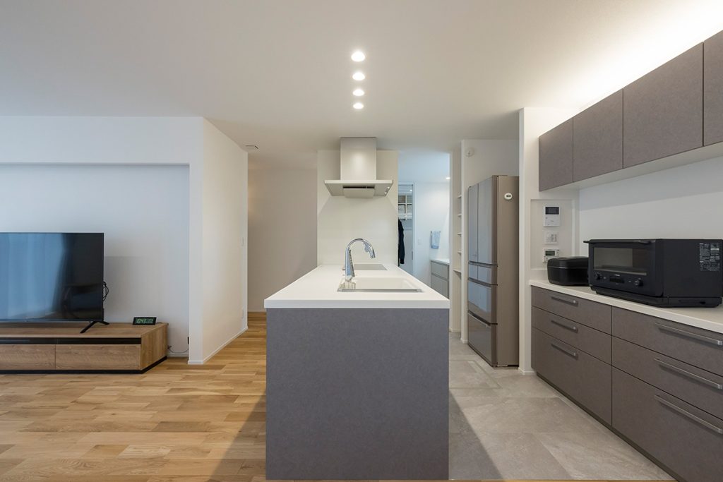 キッチンはパナソニックのラクシーナ。キッチン裏からランドリーまで一直線にアクセス可能。