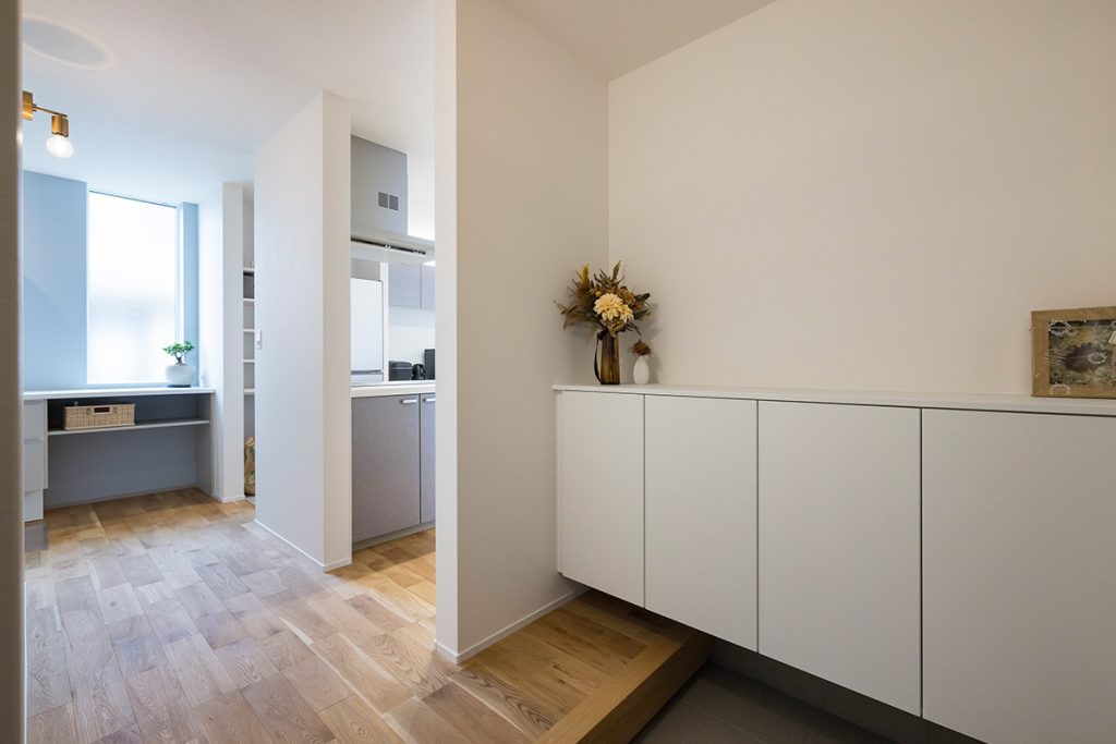玄関から手前に入るとリビング、奥から入るとキッチン、トイレ、浴室にアクセス可能。