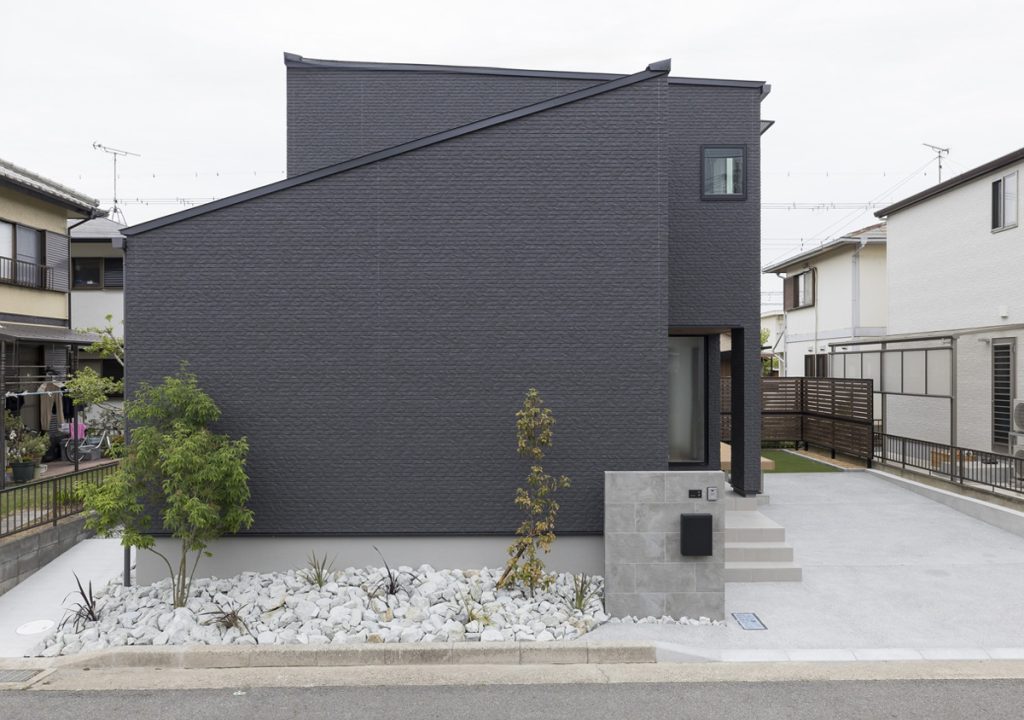 シックな外壁はKMEWラウンドウェーブ。チタンブラックの壁とロックガーデンのグレーの相性がバツグン。