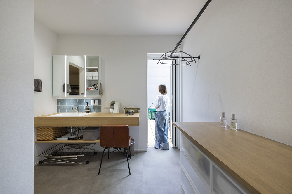 WICも備えたランドリールーム兼洗面脱衣所。中庭にもつなげて洗濯家事の時短を実現