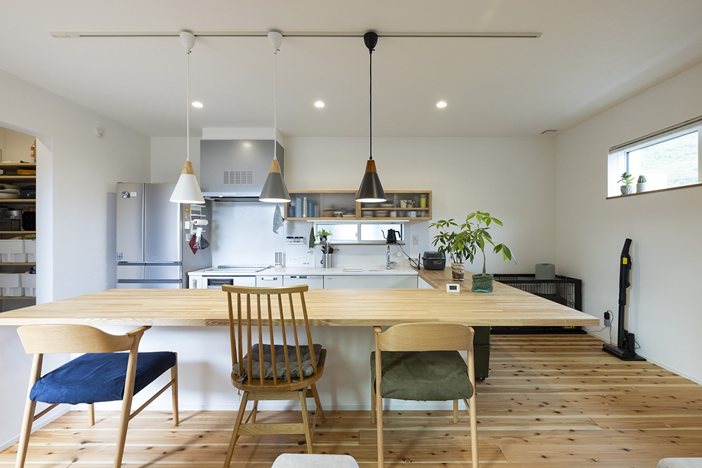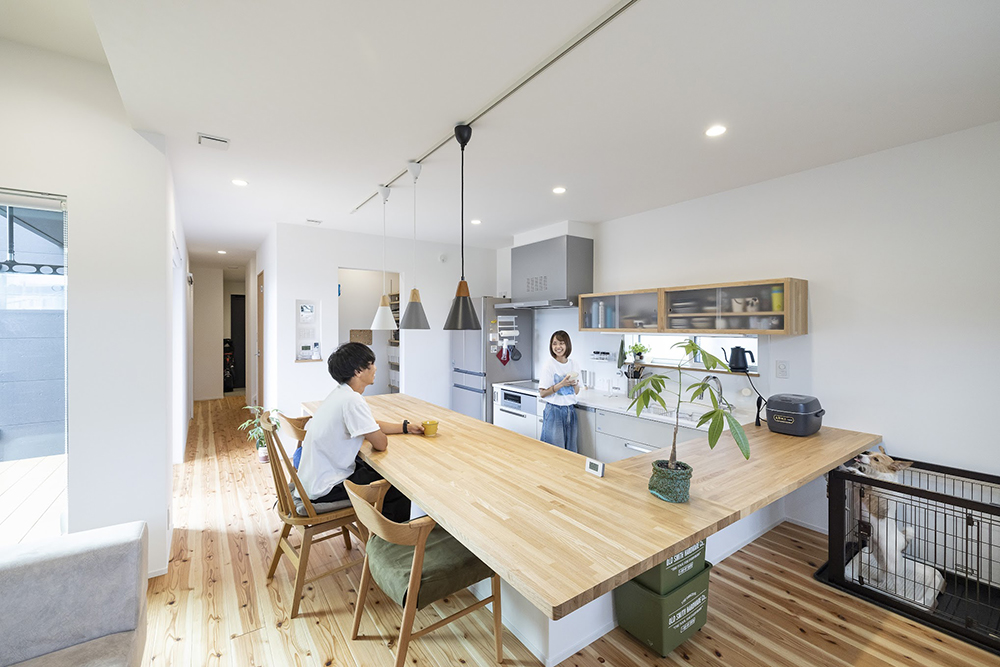 カウンターがフラットにつながったキッチンは、リビングから見てもスッキリした印象に