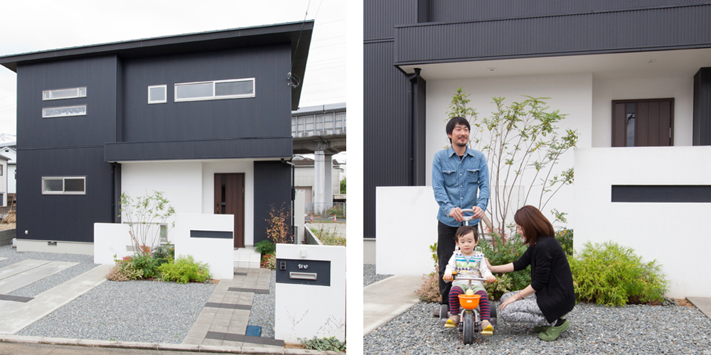 異なる素材を使ったモノトーンのシンプルなモダンな外観