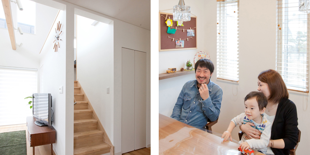 南に面した吹抜けと一体の階段は、空間の拡がりに奥行き感がプラス
