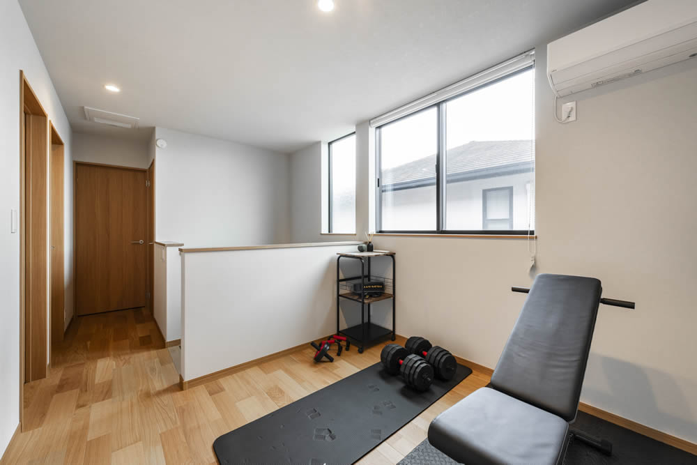 階段を上がるトレーニングルームが。室内でも日差しを浴びながら、おうちで運動できます。
