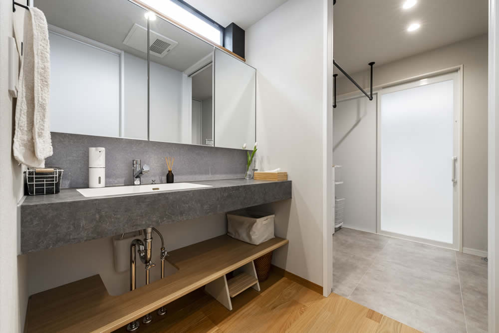 洗面はシンプルに使いやすく。掃除のしやすさもしっかり考えられています。隣にはランドリールームもあります。