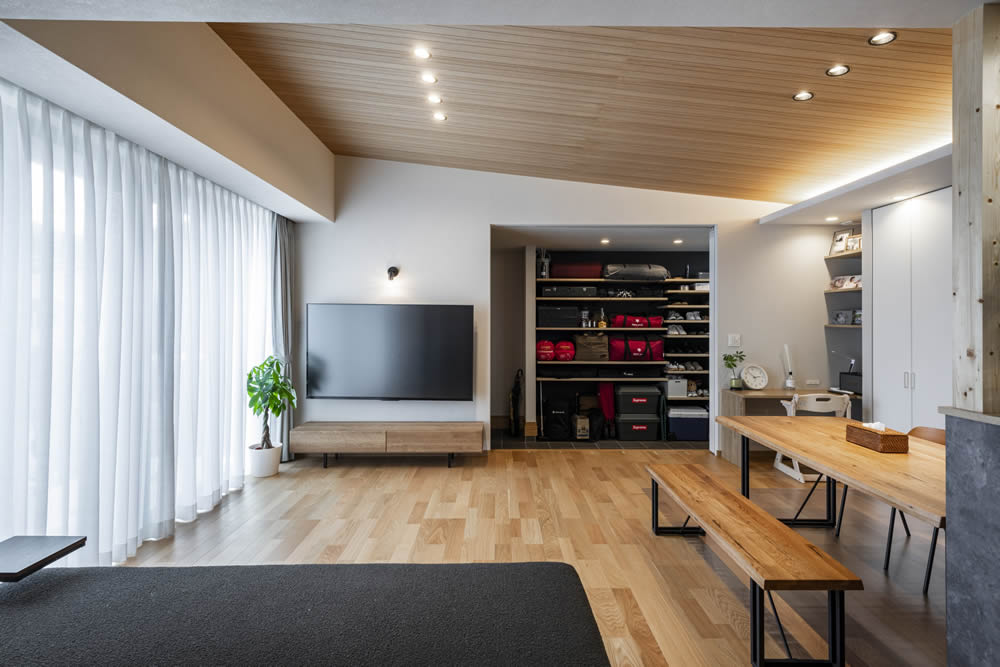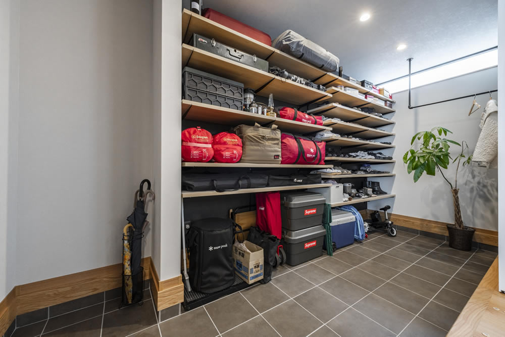 大人気のシューズクローク。アウトドア用品や靴やアウター等をひとまとめにすることで、動線が短くなり、使い勝手抜群です。