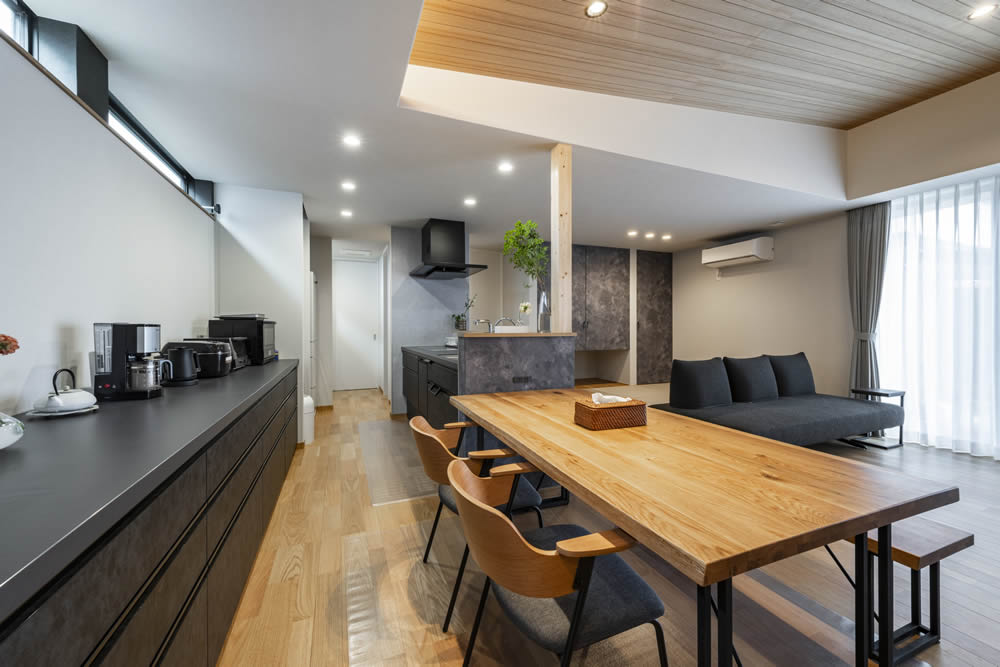 ダイニングテーブルはキッチンの横に設置して一直線に。後ろには大容量の収納もあります。