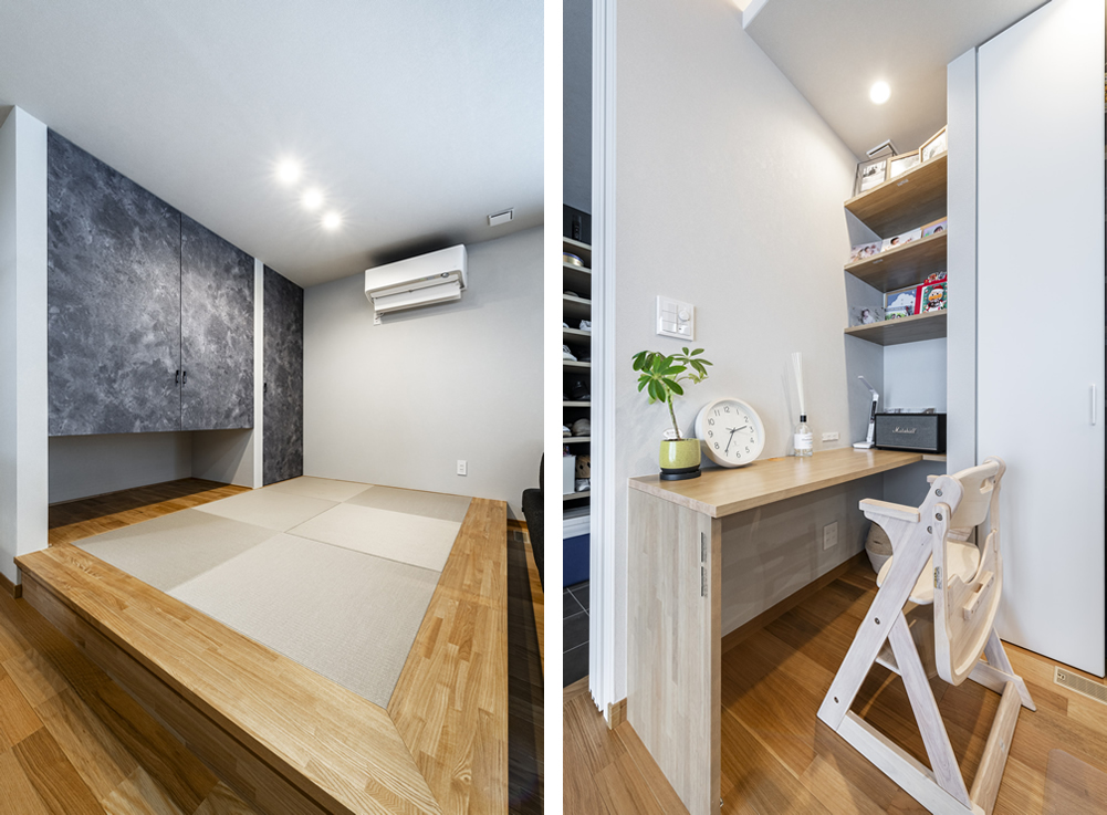 小上がりで畳スペースを確保。コンパクトなワークスペースもあります。